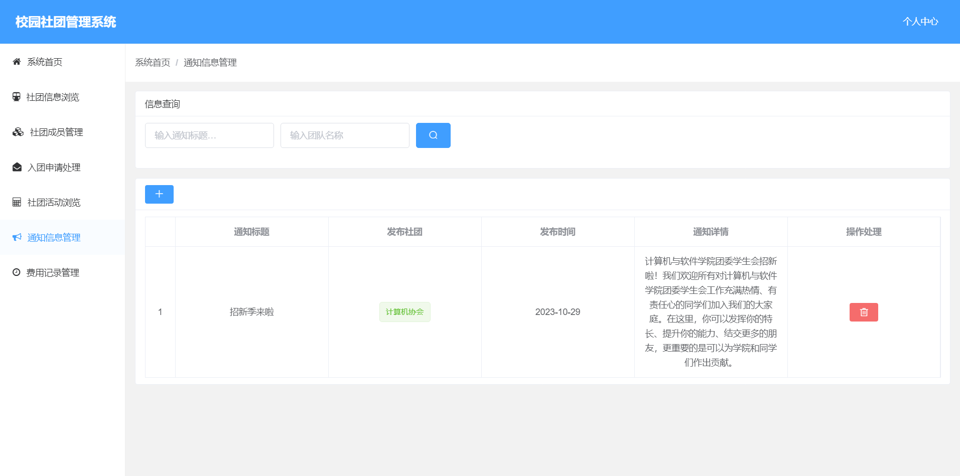5.社团通知管理:可以查看,发布社团活动,删除本社团发布的通知