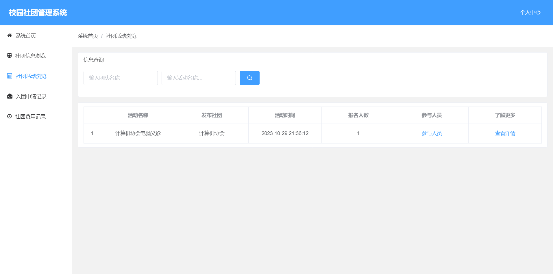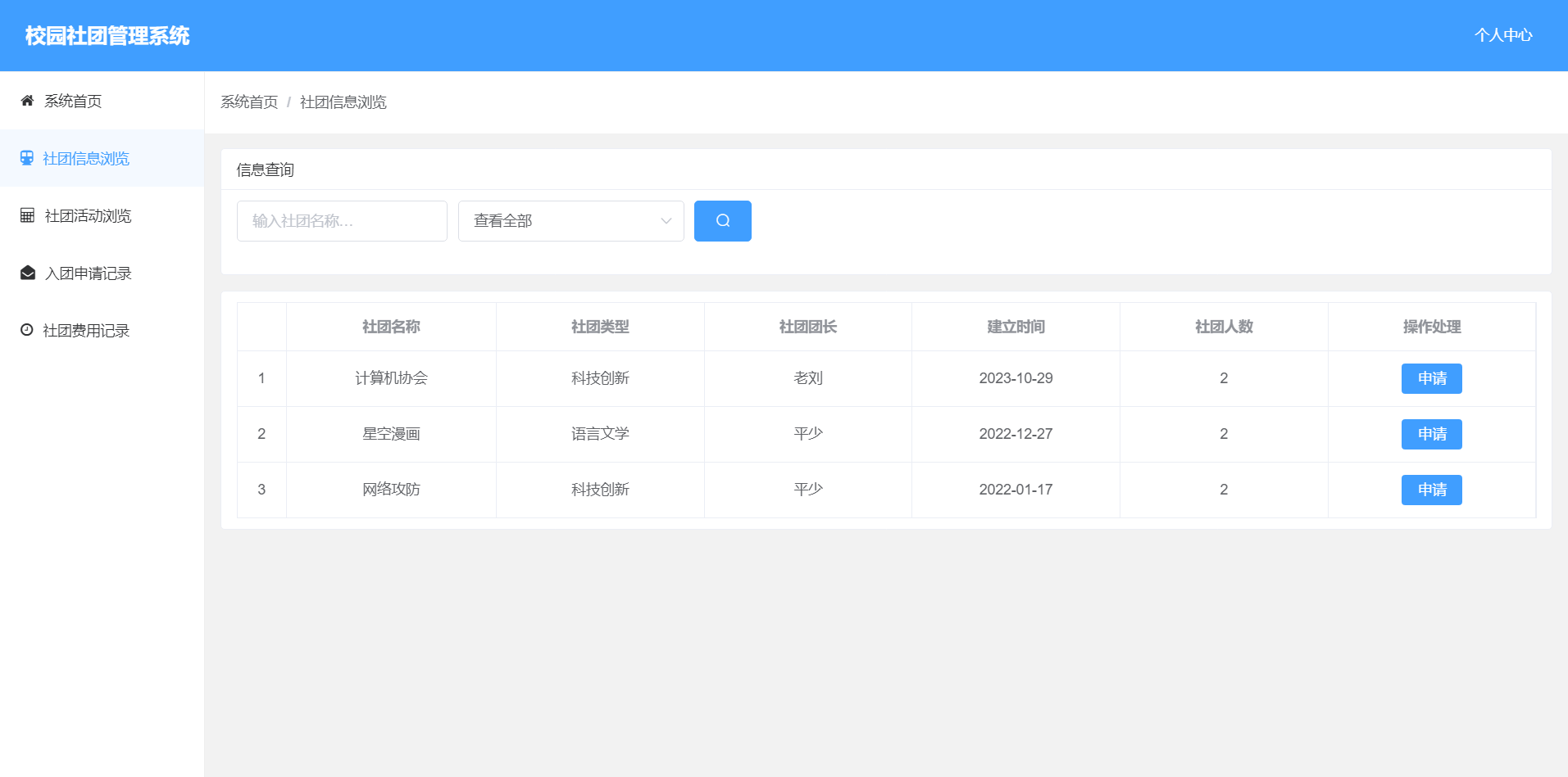3.浏览社团信息:可以浏览所有社团及其基本信息。
