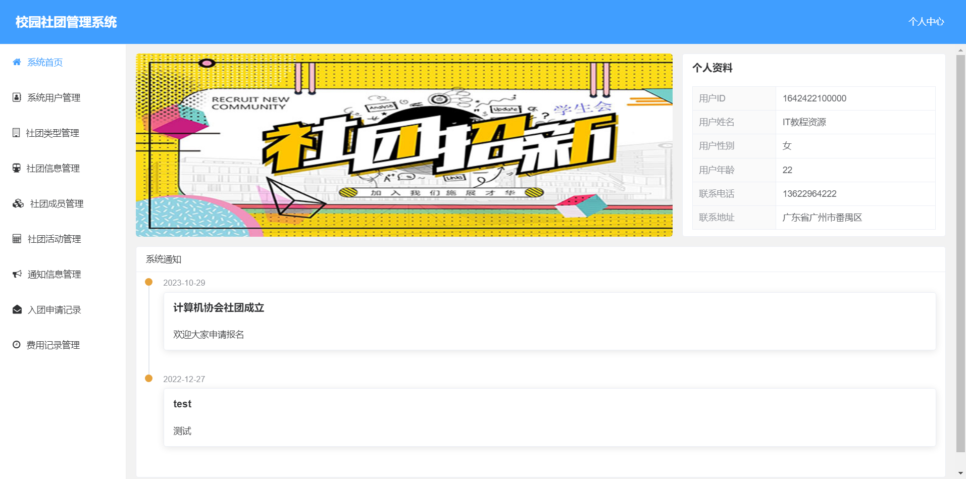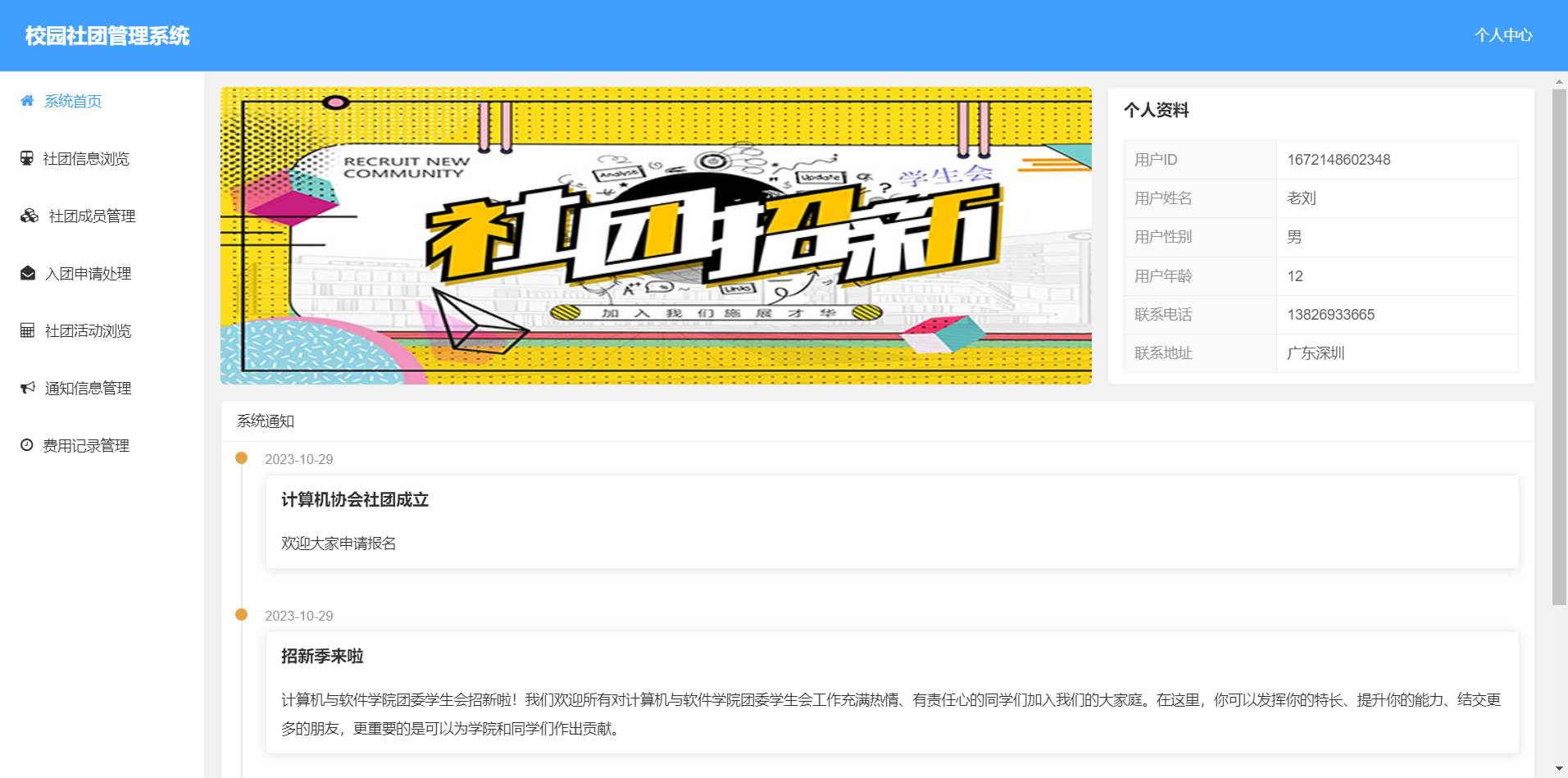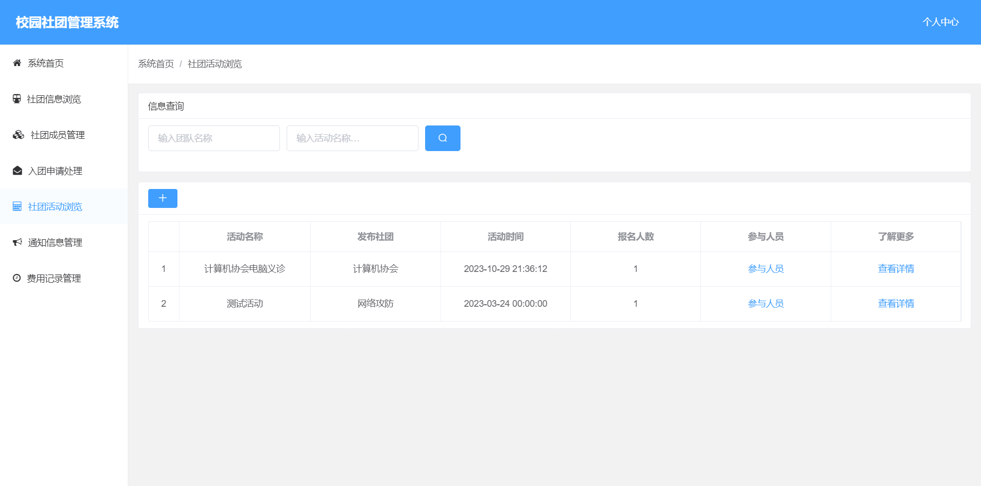 4.社团活动管理:可以查看和发布社团活动。