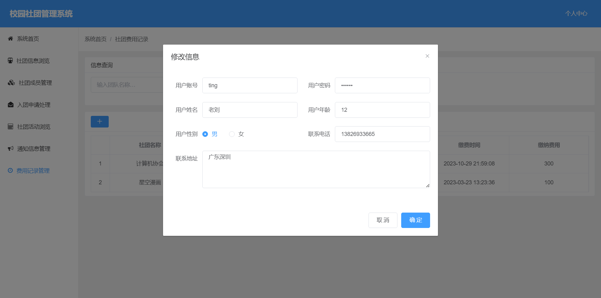 6.社团费用管理:可以查看,删除,根据社员编号发布缴费通知。