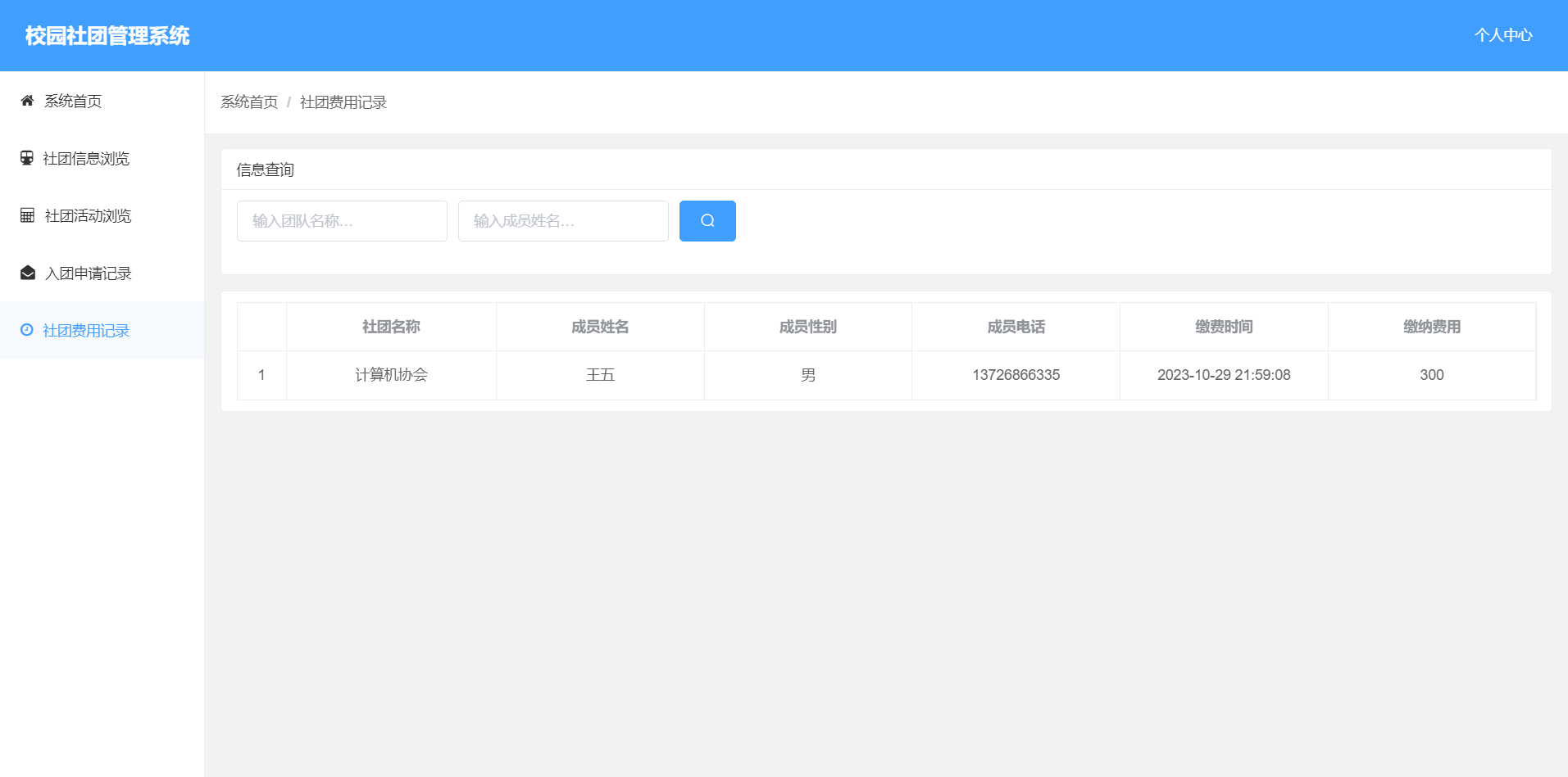 7.查询缴费记录:可以查询各个社团的缴费记录。