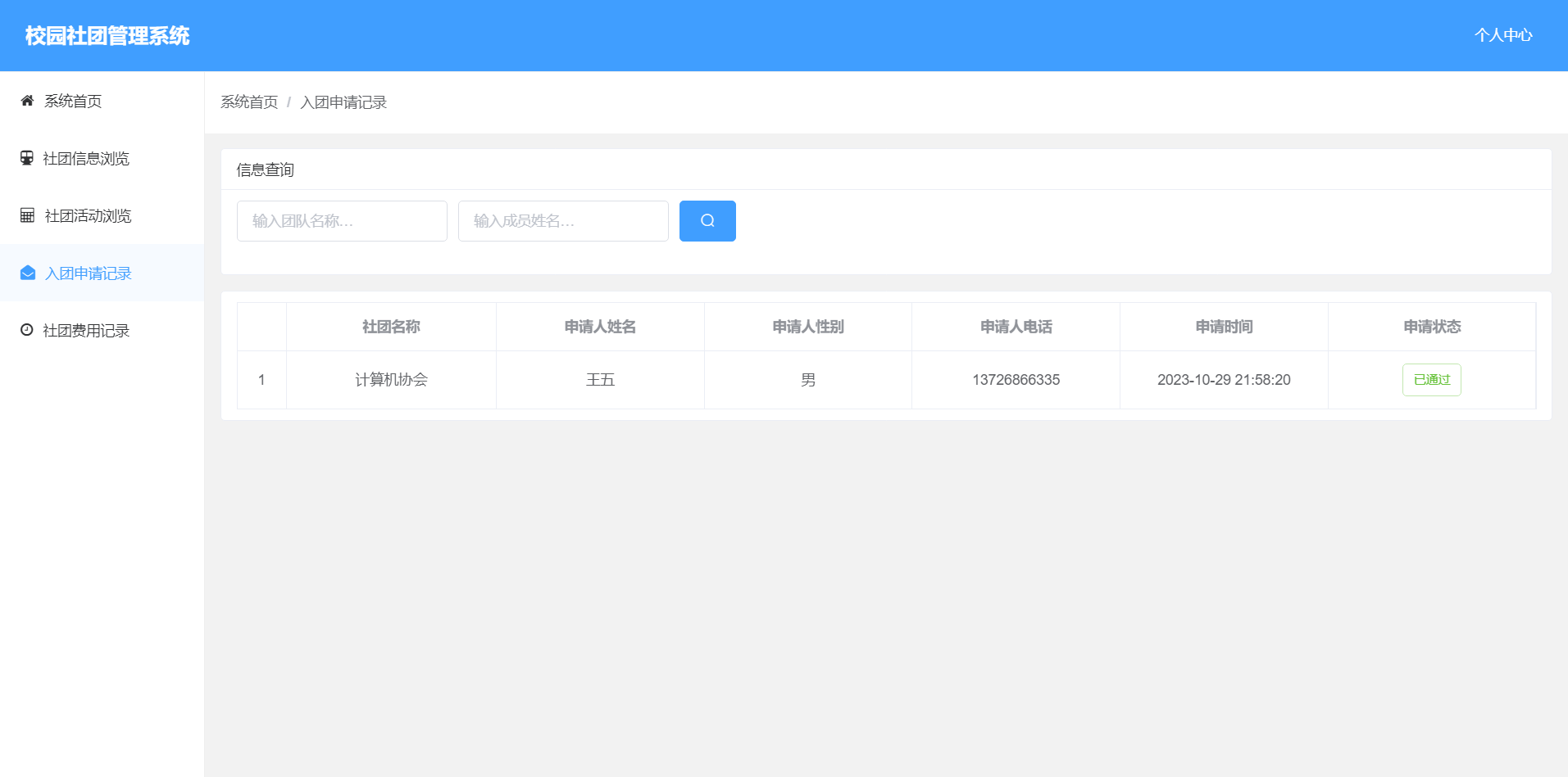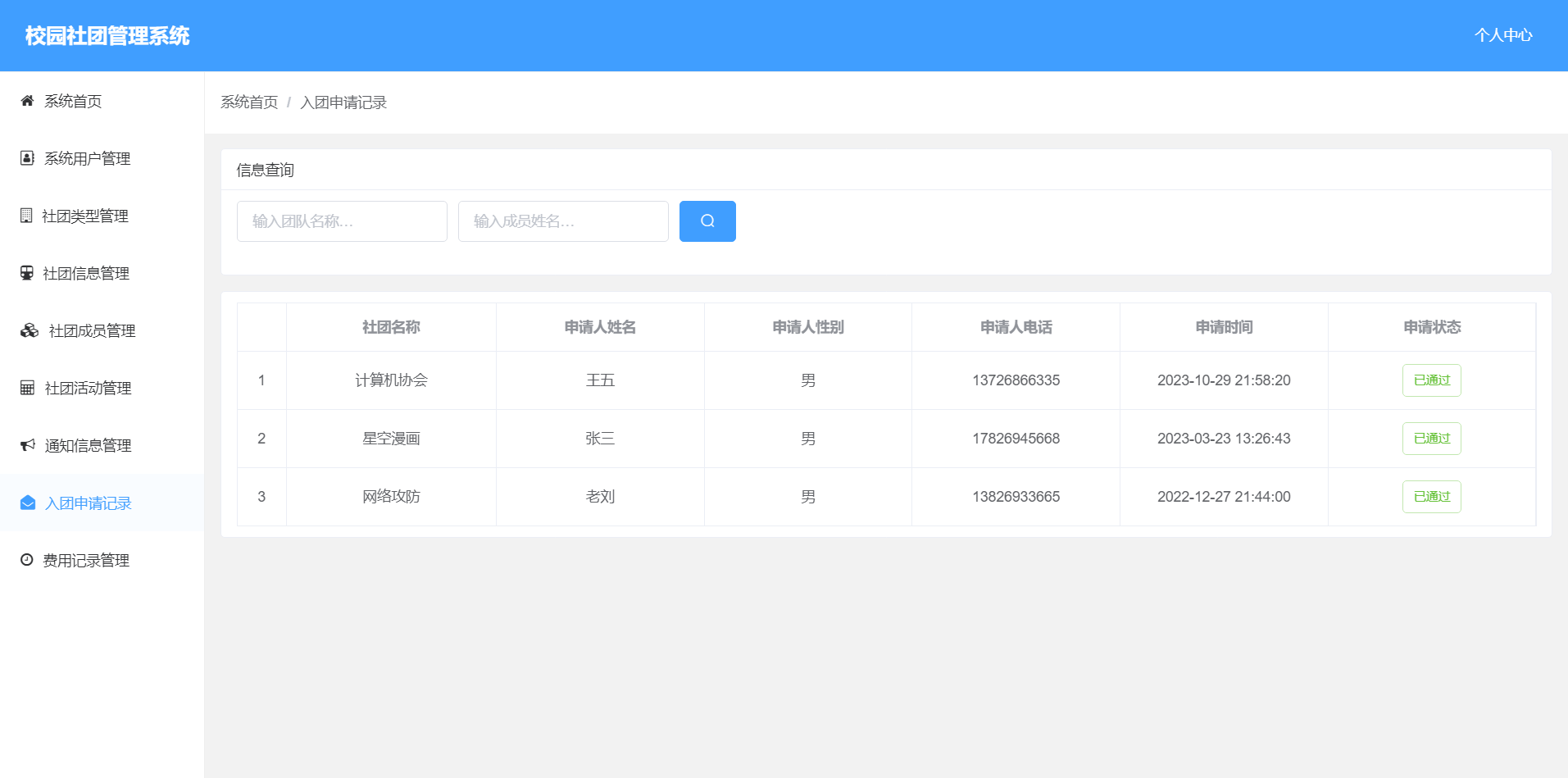 2.入团申请处理:可以对提交社团申请的用户进行审核。