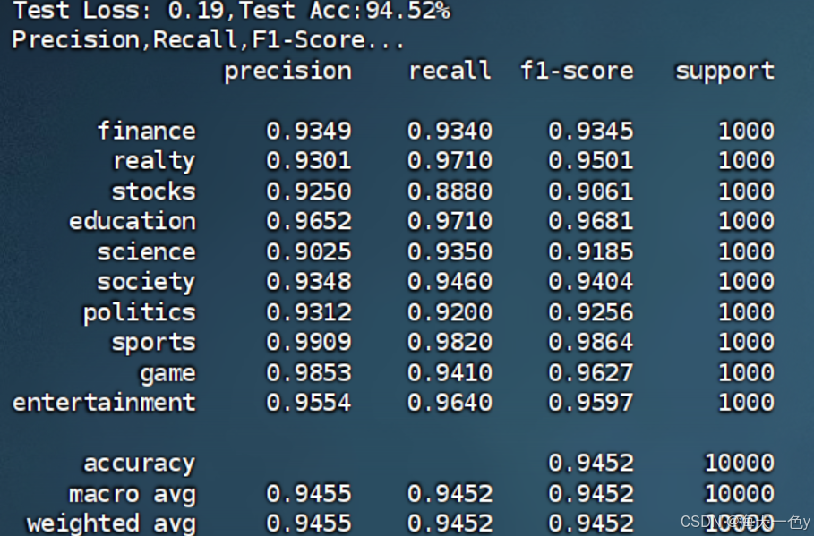 可以看到,在10000条的测试集上的模型精确率为91.47%,召回率为91.47%