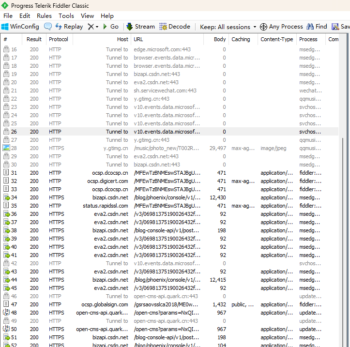 (电脑上很多程序都不安分 在后台搞动作 在fiddler这里可以看到 下面展示一下我的界面哈哈)