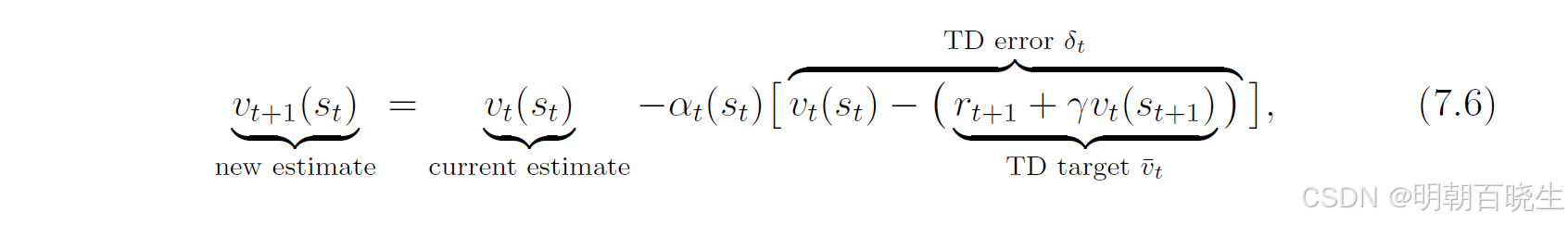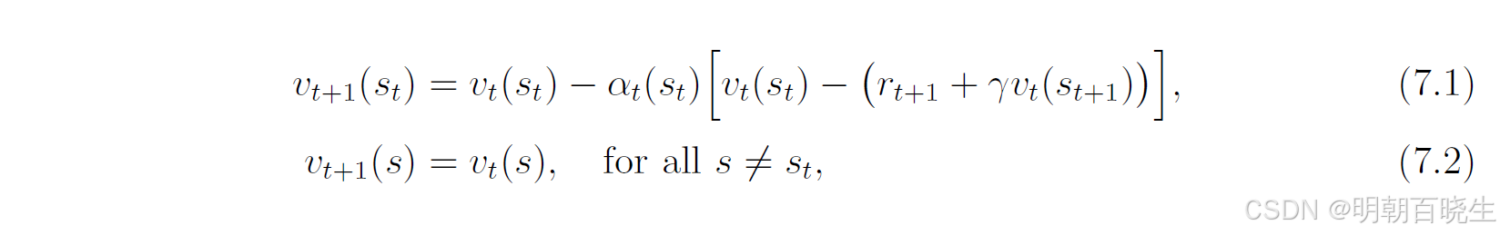 需特别注意,在t时刻仅更新被访问状态的估值,如式(7.2)所示未访问状态