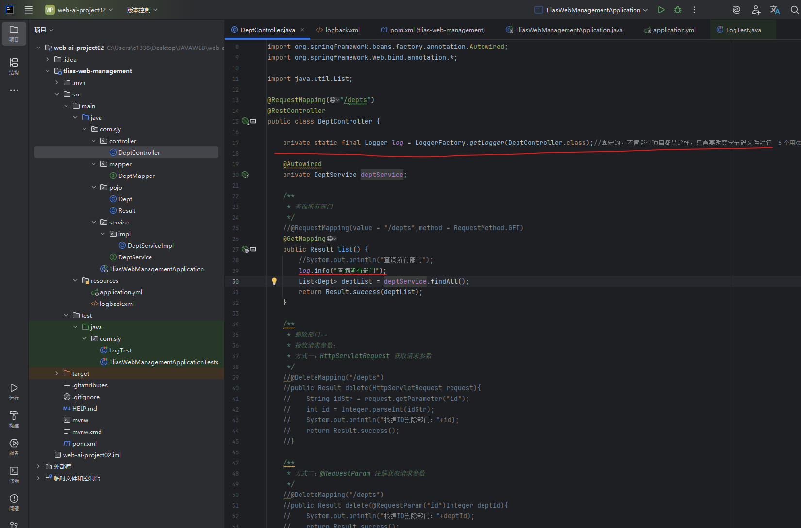 只需要在类内定义一个Logger对象(注意我这里使用的是org.slf4j的Logger对象)