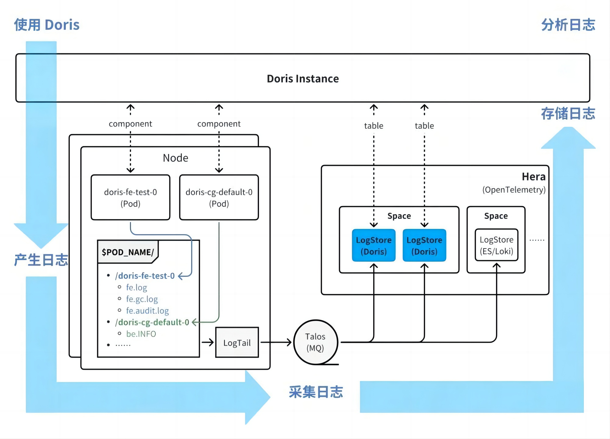 在日志采集方面,采用自研的 Hera(log tail 组件)实现高效采集,同时,借鉴社区的日志检索场景实践,将 Doris 作为 OpenTelemetry 的存储后端:Doris 自身运行产生的日志经采集后,最终回流并存储至 Doris 内部表中,形成 "日志产生 - 采集 - 存储 - 查询" 的闭环。