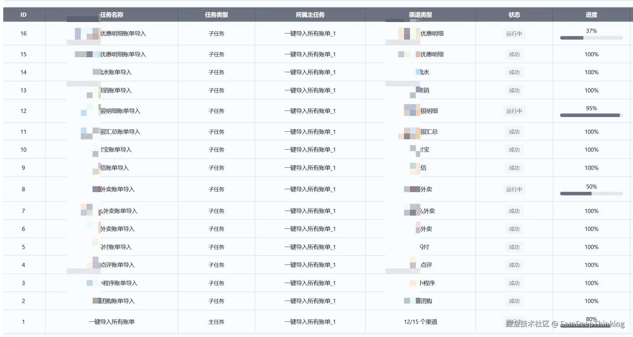 - 子任务(ID=2-16): 各渠道独立执行,部分已成功完成(100%),部分仍在运行中
