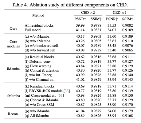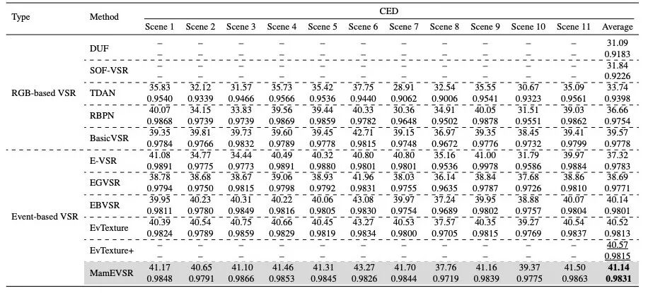 对比实验在 CED 数据集上(见表1、表3),MamEVSR 在 任务中取得 PSNR 41.14 dB 和 SSIM 0.9831,优于所有对比方法。在 REDS4 数据集上(见表2),MamEVSR 在 任务中也取得最优表现。