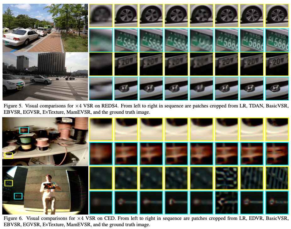 - 可视化对比图5和图6展示了 MamEVSR 在细节恢复(如车轮纹理、车牌)上优于其他方法,重建结果更接近真实图像。