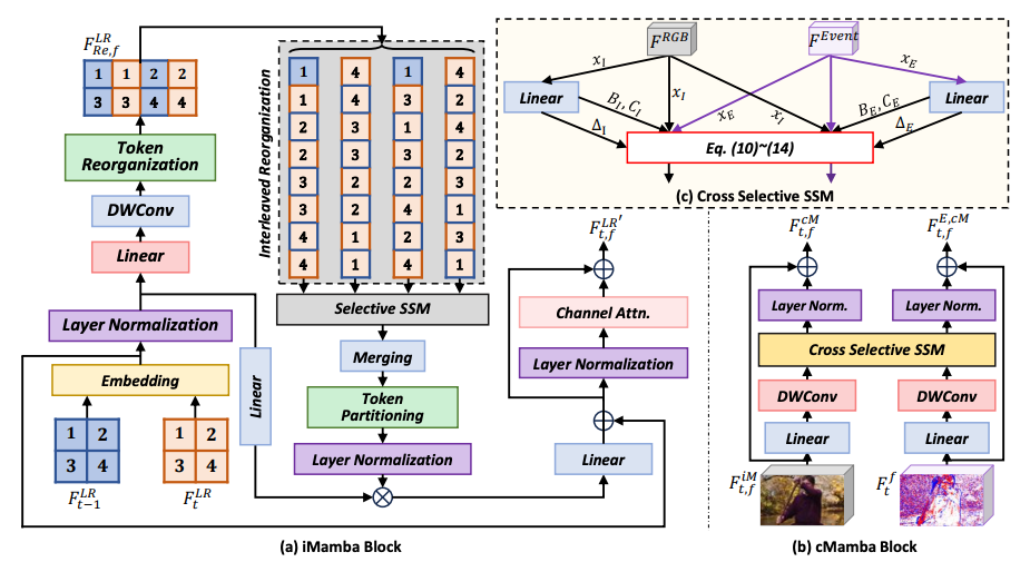 cMamba 模块该模块用于融合图像特征 和事件特征 。通过交叉选择性状态空间建模(Cross Selective SSM),实现跨模态信息交互: