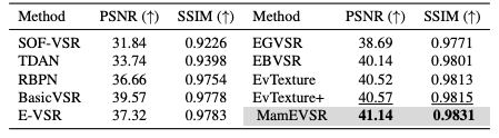MamEVSR 通过引入状态空间模型,有效融合事件与图像信息,在多个数据集上实现了最优的视频超分辨率重建效果,同时保持了线性计算复杂度。