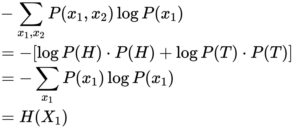 &= -[P(H,H) \log P(H) + P(H,T) \log P(H) + P(T,H) \log P(T) + P(T,T) \log P(T)] \\