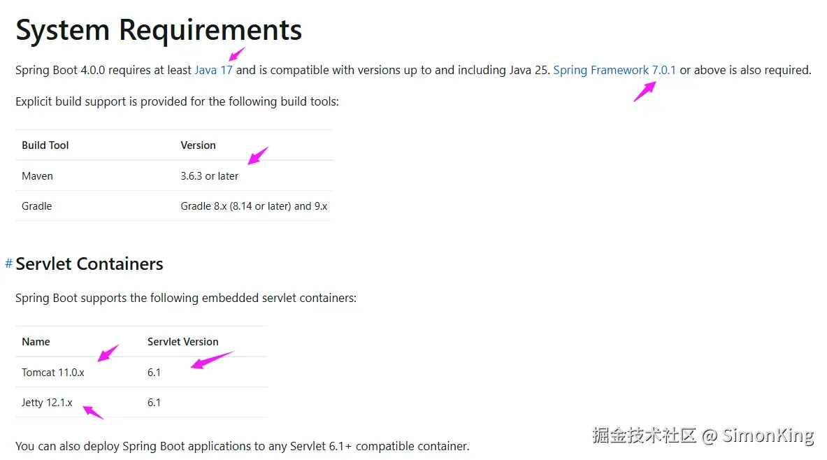 Spring Boot 4.0.0 至少需要Java 17,并且兼容包括 Java 25 在内的更高版本。同时还需要Spring Framework 7.0.1或更高版本。编译工具Maven ≥ 3.6.3,Gradle ≥ 8.14、Servelet容器也分别给出了最低要求。