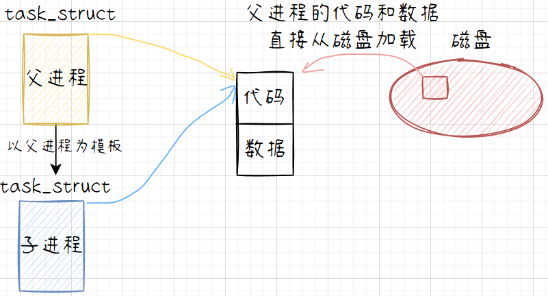 如上图所示,子进程是以父进程为模板创建的。默认情况下,fork()之后,代码和数据一般都是父子进程所共享的。