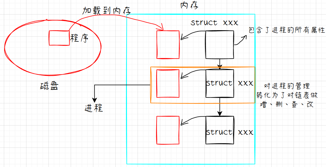 再将这一个个节点组织成链表,这样对进程进行管理就转化成了对这个链表进行增、删、查、改。