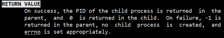 此时就需要了解fork的返回值了,关于fork的返回值,在man指令的交互界面输入/return value即可显示: