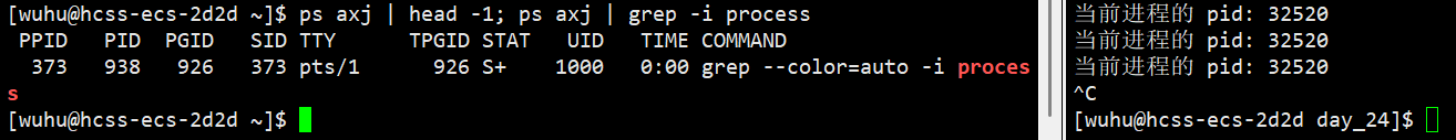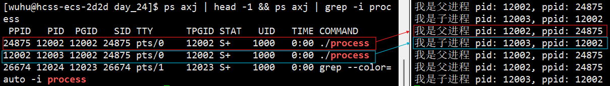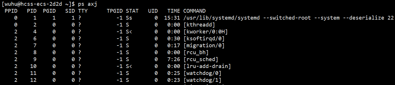 它会显示一长串,我们进行过滤一下,只要第一行和指定进程的信息。ps axj | head -1; ps axj | grep -i process。