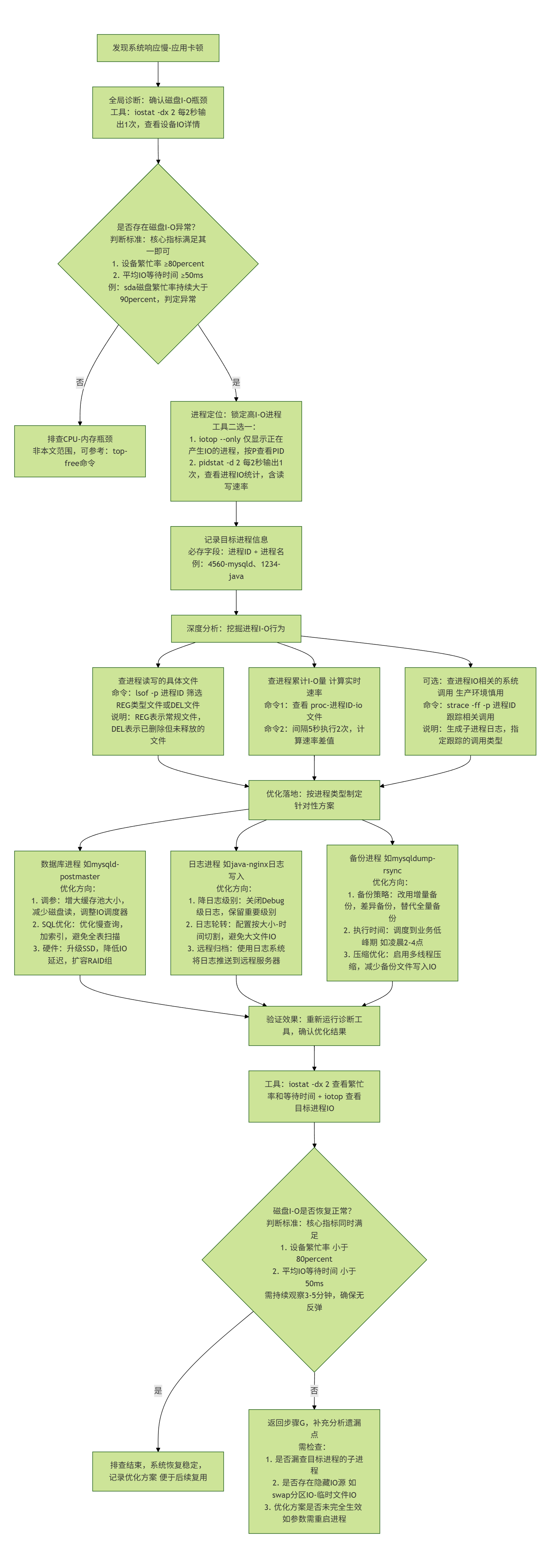 Linux 磁盘 I/O 高占用进程的排查需遵循"从全局到局部、从现象到本质"的逻辑,通过标准化流程可高效定位问题并落地解决方案。以下为完整排查流程拆解及可视化流程图。