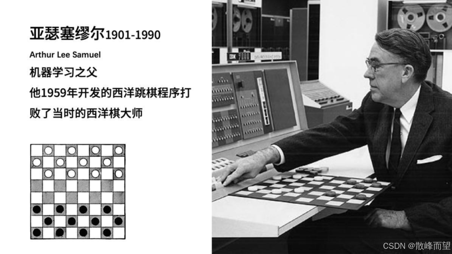 - 1959 年,亚瑟·塞缪尔开发了首个自学习程序-西洋跳棋程序,并引入了"机器学习"这一概念