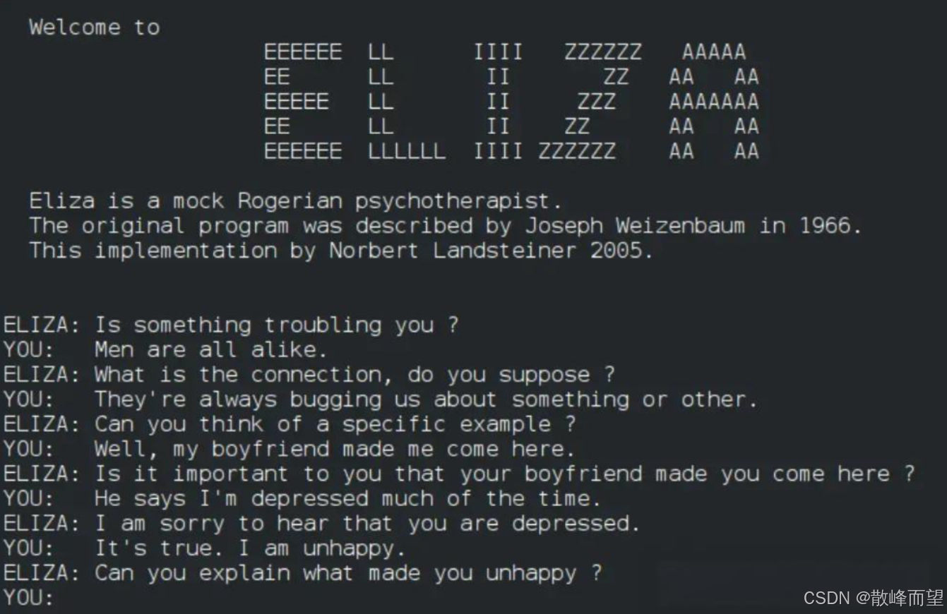 ELIZA用程序的方式模拟提问,形成一种心理咨询的效果,其实就是模式匹配,号称心理治疗师。