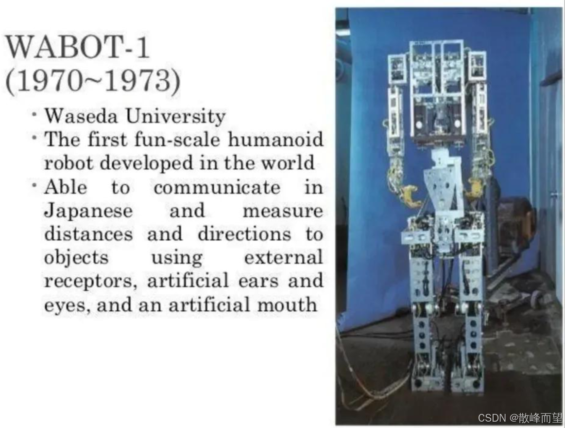 - 1970年,第一个拟人机器人 WABOT-1 在日本早稻田大学建成。它由一个肢体控制系统、视觉系统和一个对话系统组成。