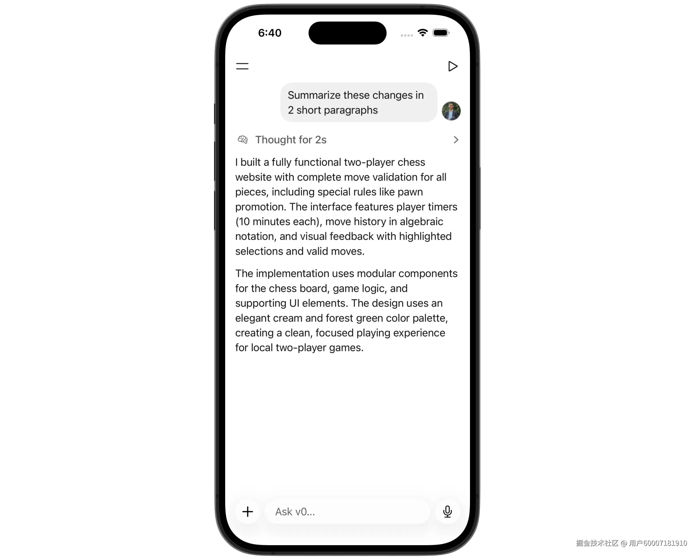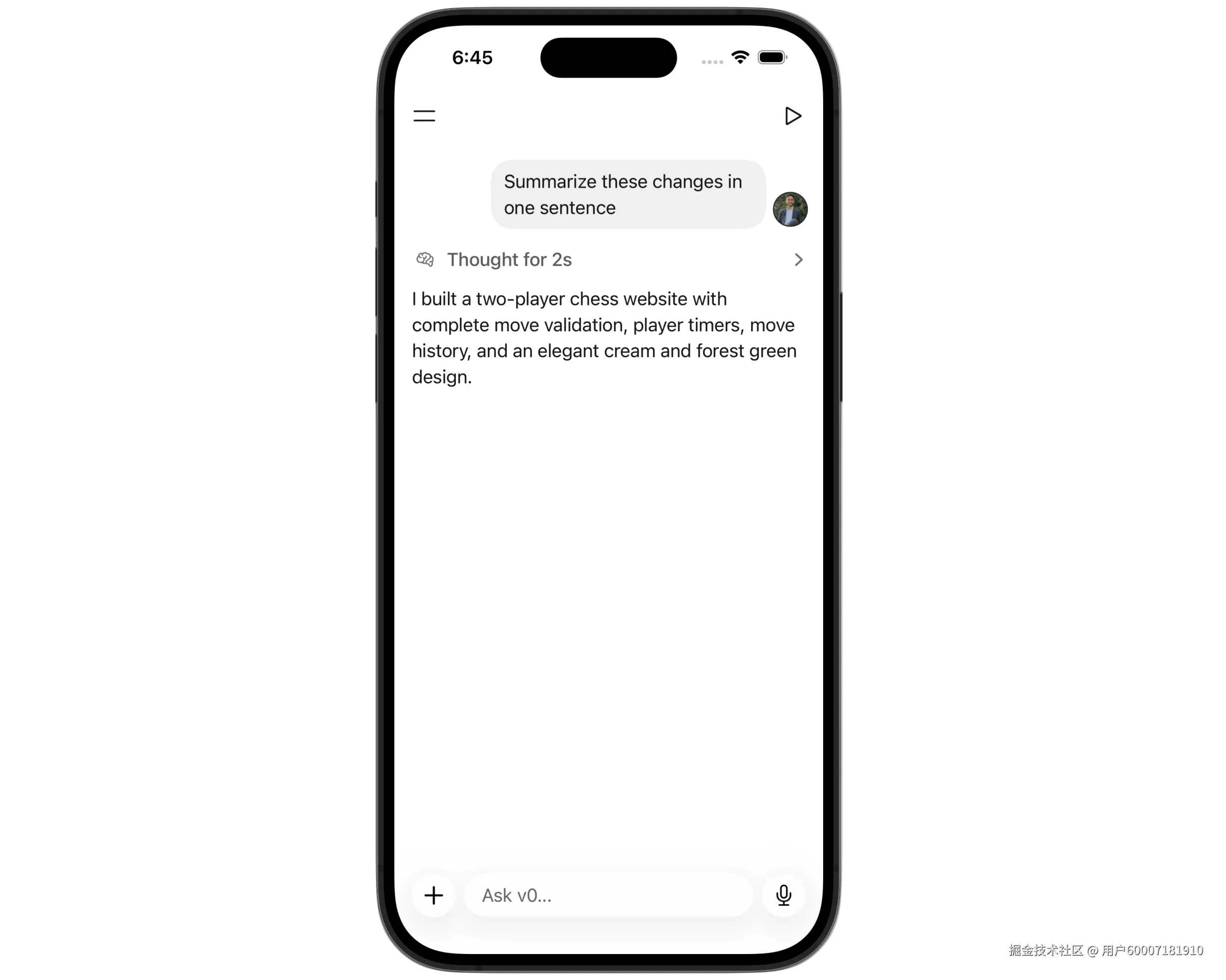 当你在v0版本发送消息时,消息气泡会平滑淡入并滑动至顶部。用户消息动画完成后,助手消息会立即淡入显示。