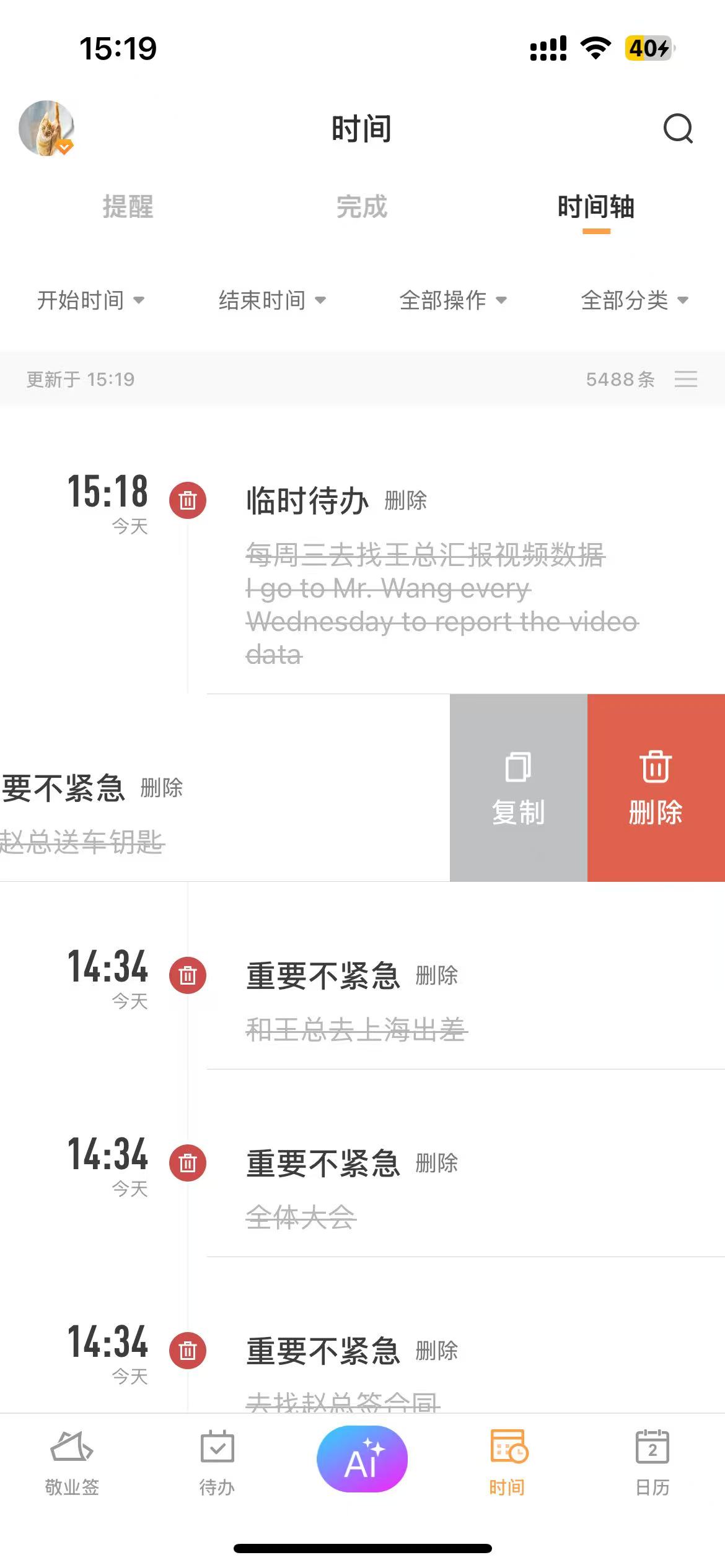 最让人安心的是它的时间轴备份功能。用户每一次新增、修改或删除内容,都会被实时同步到云端时间轴,即便误删也能轻松找回。操作很简单:打开APP进入"我的",找到时间轴选项,就能按时间线查看所有历史记录,选中误删内容重新复制到列表下记录即可。相比普通备忘录30天的恢复时限,敬业签的永久备份让数据安全更有保障。
