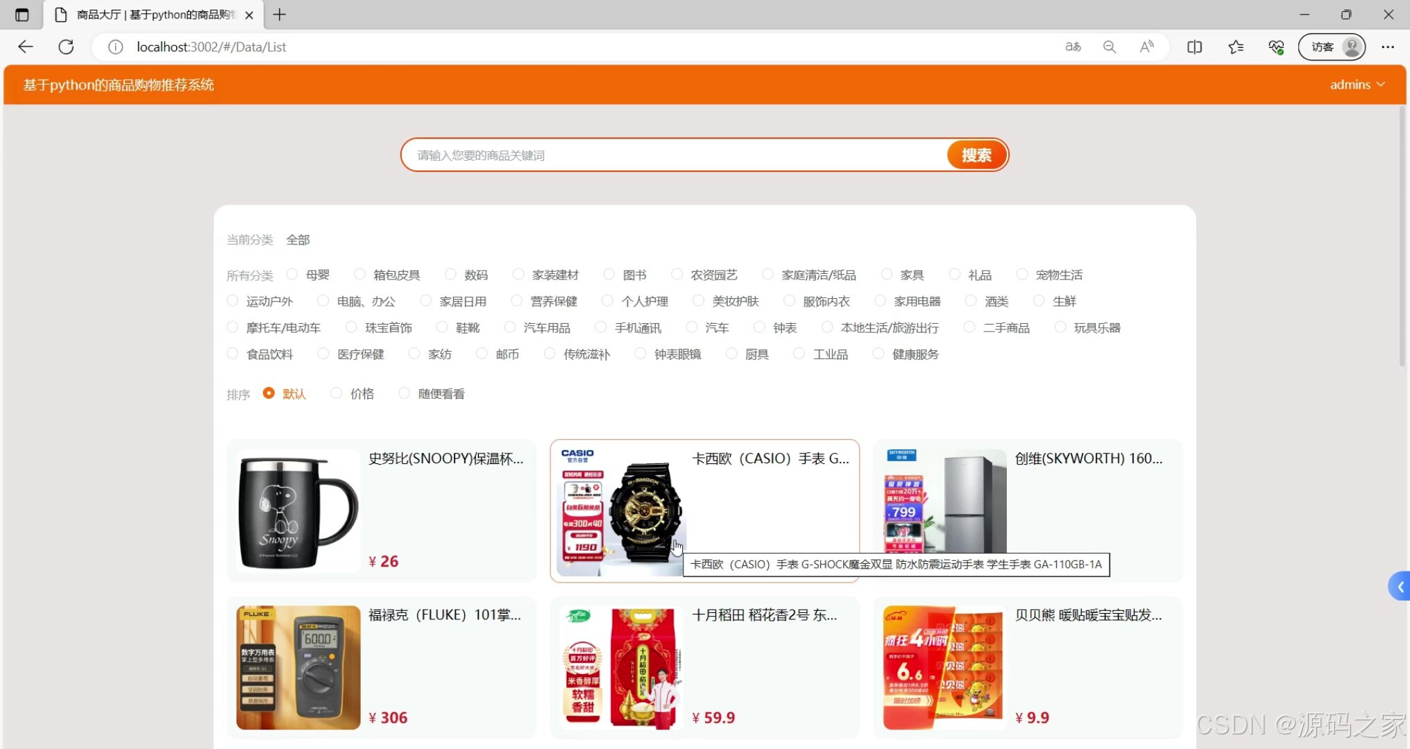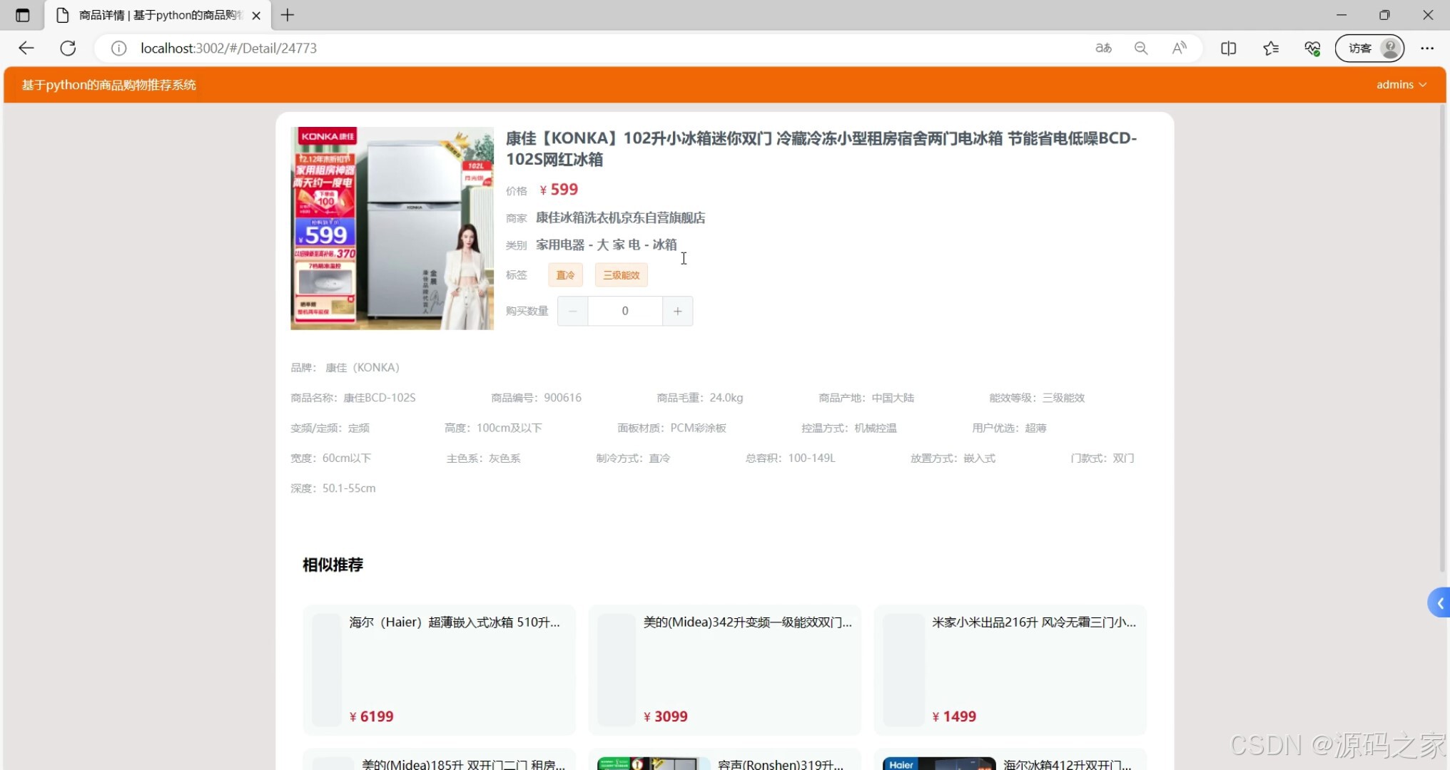 在电商行业竞争白热化的背景下,"精准推荐"与"便捷购物"成为用户核心需求,传统电商平台因推荐同质化、操作流程繁琐难以满足需求。本项目设计并实现基于协同过滤的智能推荐购物平台,通过全栈技术整合与算法应用解决上述痛点。系统采用前后端分离架构:后端以Python+Django为核心,搭建稳定的业务逻辑层,通过django-simpleui快速构建后台管理界面,MySQL数据库存储商品、用户、订单等核心数据;前端基于Vue3生态,结合Element Plus组件库、Tailwind CSS与Vite打包工具,打造响应式购物界面,TypeScript保障代码可维护性。数据支撑层面,通过Scrapy爬虫框架与requests工具,配合XPath页面解析,定向采集电商平台商品数据(如参数、价格、评价),经清洗后补充至数据库,为推荐算法与商品展示提供丰富素材。核心推荐功能依托协同过滤算法实现:系统收集用户浏览、购买、评价等行为数据,计算用户间偏好相似度(如余弦相似度),筛选相似用户群体的高兴趣商品,同时结合商品关联度分析,为用户生成个性化推荐列表,有效提升推荐精准度与用户点击转化。业务流程上,系统覆盖完整电商场景:用户通过首页检索或推荐模块发现商品,进入详情页了解信息后加入购物车,结算生成订单,个人中心可查看历史订单与修改信息;管理员通过后台管理商品上下架、维护用户权限、统计销售数据,保障平台稳定运行。整体而言,该平台实现了"数据采集-精准推荐-购物转化-后台管理"的闭环,既提升用户购物效率与满意度,也为电商运营提供数据驱动的决策支持,同时其企业级技术栈配置使其成为全栈开发与推荐算法方向的优质实践项目,兼具实用价值与学习意义。