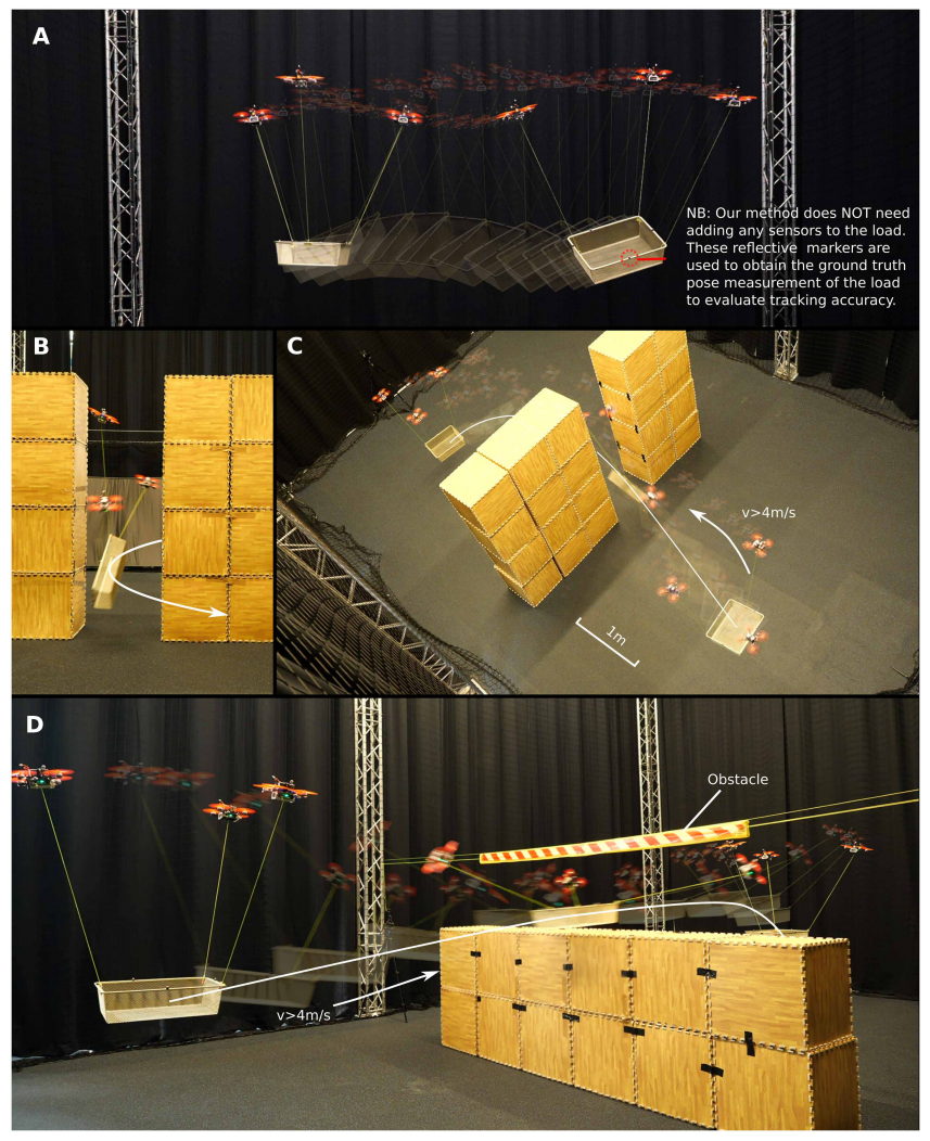 团队在实验室中使用三架改装自Agilicious平台的无人机,协同搬运1.4 kg的负载。
