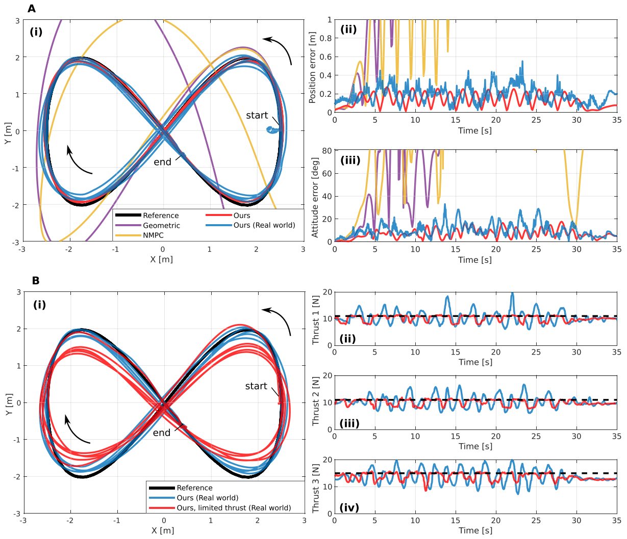 图3|快速轨迹跟踪表现:该图对比了研究方法与两种基线方法在快速轨迹跟踪中的表现。(A) 在跟踪8字形快速轨迹时,研究方法在速度达到5 m/s、加速度达到8 m/s²的条件下,依然能够精确跟踪,表现出比传统方法更高的稳定性和灵敏度。(i) 飞行路径展示了负载质心的轨迹;(ii) 和(iii) 进一步展示了在跟踪过程中,研究方法与基线方法在位置和姿态上的跟踪误差对比。(B) 在推力限制的实验中,尽管最大推力受到限制,研究方法仍能有效调整轨迹,保持稳定性,远超传统方法的性能