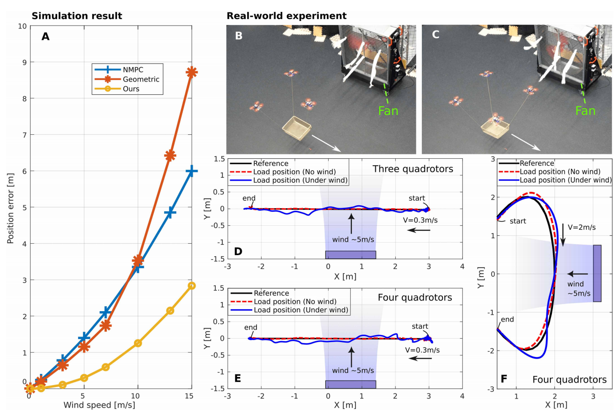 图5|这组图对比了风干扰条件下,研究方法与基线方法的性能。(A) 在仿真中,随着风速的增加,研究方法在5 m/s风速下保持了较低的跟踪误差,而传统方法在相同条件下则表现较差。(B) 和(C) 展示了在实际风场中,四旋翼系统在风速5 m/s下,依然能够成功完成轨迹跟踪任务,证明了该方法对外界扰动的高鲁棒性。(D) 和(F) 展示了四旋翼在风场中跟踪复杂曲线路径的表现,进一步验证了系统的动态适应能力