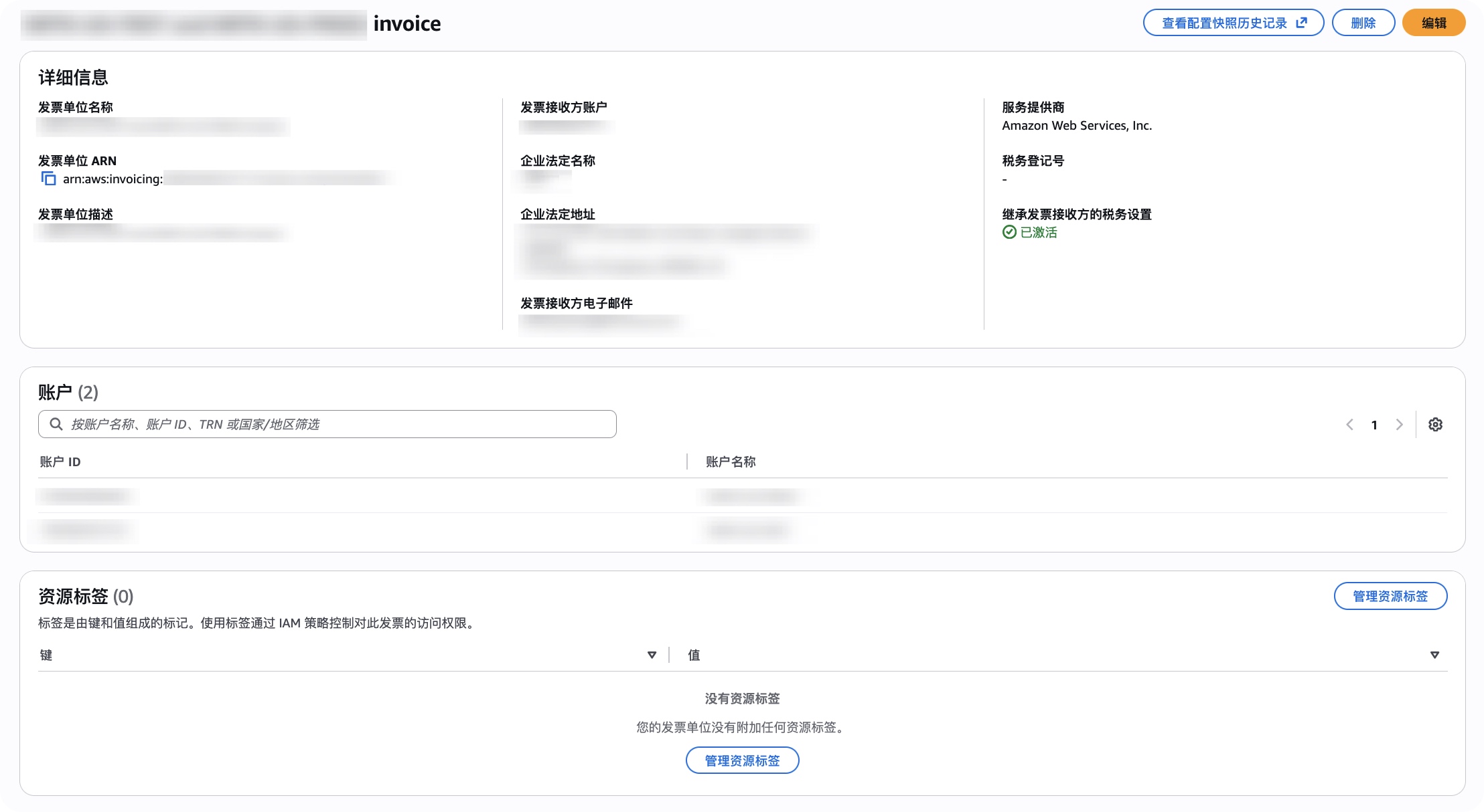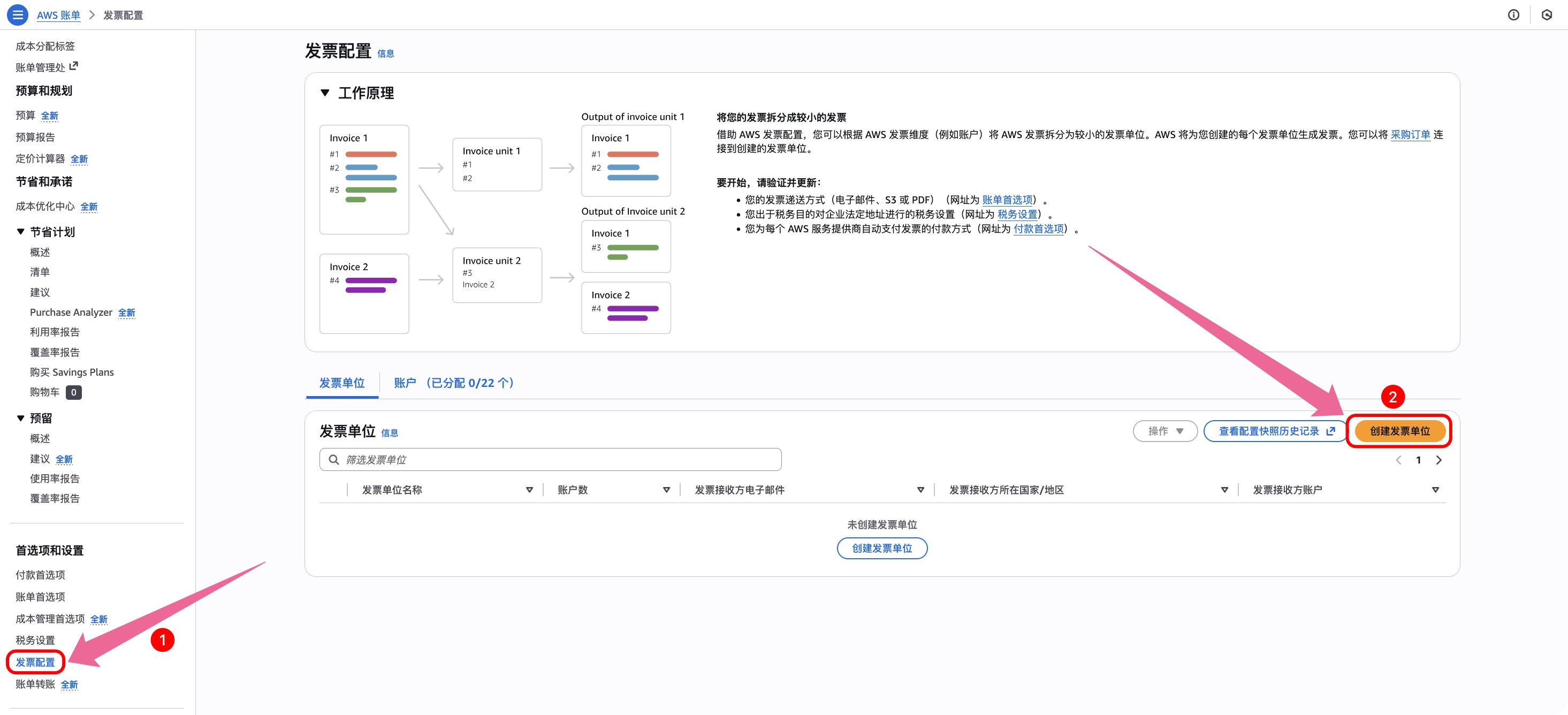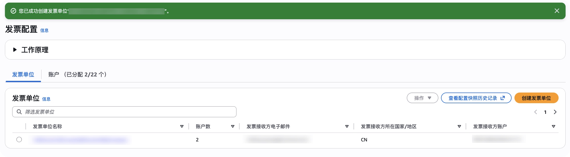 - AWS 发票配置不会自动向发票单元添加新账户。创建新账户后,您必须手动将其添加到发票单元,或者使用发AWS 票 APIs。
