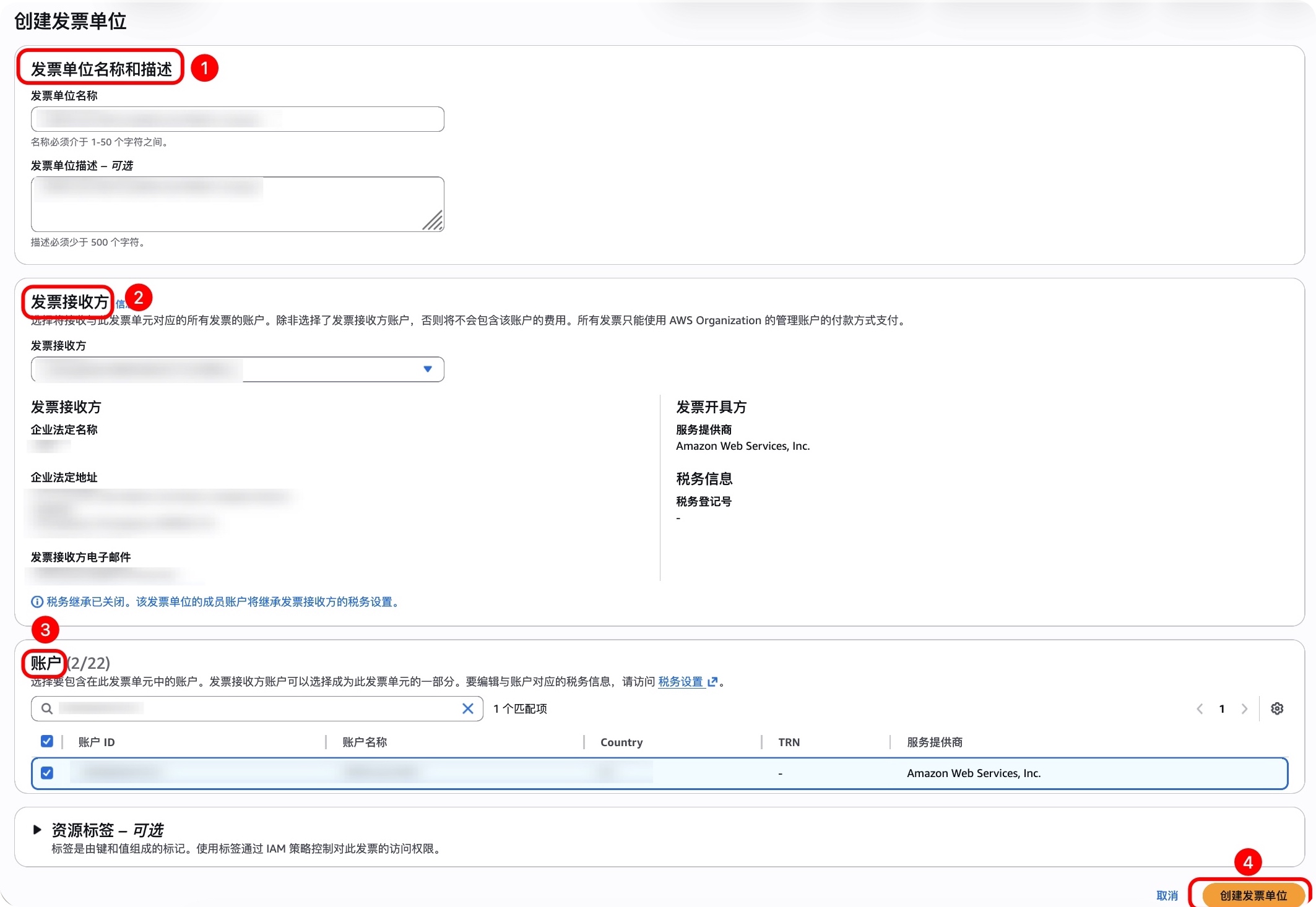 (1) 在发票单位名称 中,输入一个在您的账单中与众不同的唯一名称 AWS 账户。
