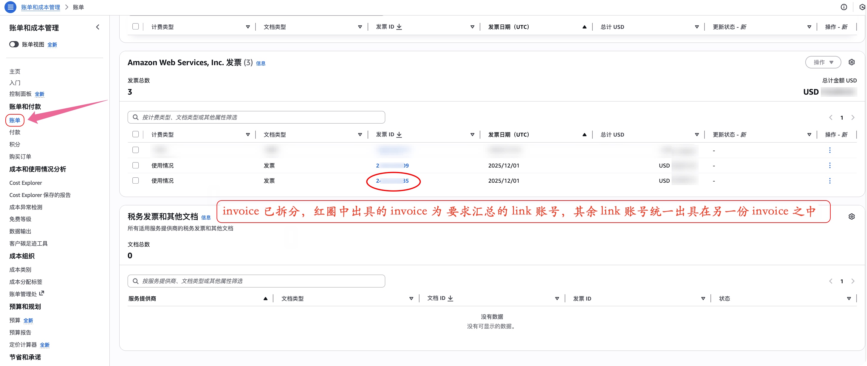 打开 AWS Billing and Cost Management 控制台。在导航窗格中,选择「账单 」------选择「发票 」。点击下载已签发的invoice进行查看核对。