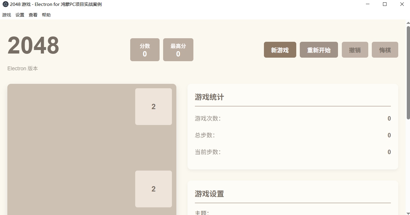 这是一个基于Electron for 鸿蒙PC的2048游戏实现,专为初学者设计。2048是一款经典的数字合并游戏,玩家通过上下左右移动方块,将相同数字合并,最终目标是获得2048方块。
