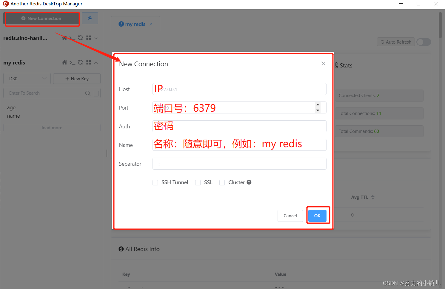 1.安装可视化工具,如下演示为:Another-Redis-Desktop-Manager.1.4.5
