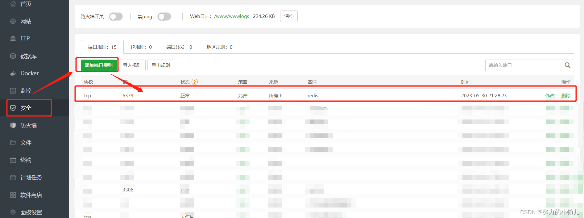 宝塔面板:安全 ------> 添加端口规则 ------> 放行 Redis 对应的 6379 端口