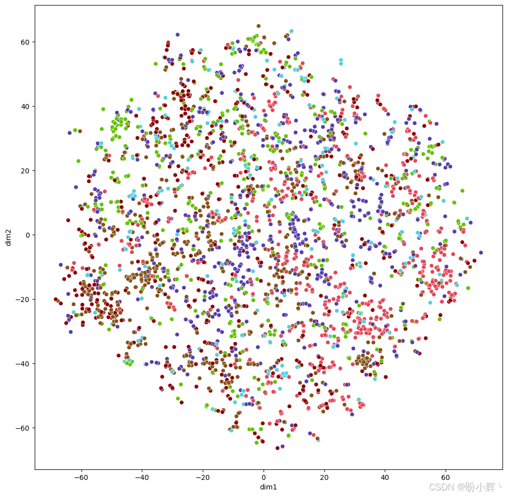 (2) 将数据集所有节点输入刚定义好的未训练 GAT 模型,生成 6 个节点类别的概率向量。随后对这些 6 维特征应用 t-SNE 降维至 2 维,实现所有节点在二维平面上的可视化: