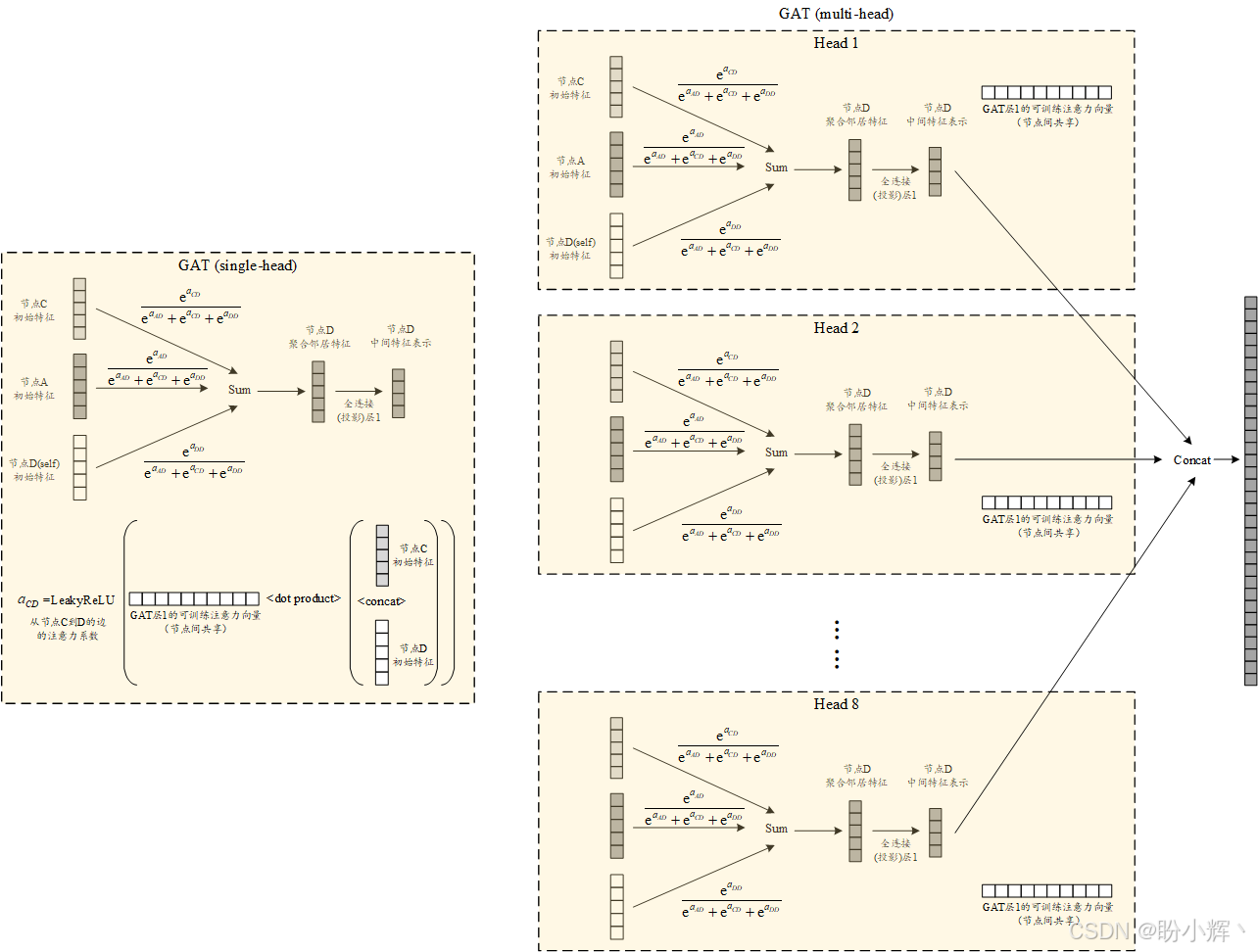 每个<节点,邻居>对的注意力系数计算过程如下:先将节点特征与邻居特征拼接,再与注意力向量做点积,最后通过 Leaky ReLU 激活函数。邻居节点的最终权重通过对注意力系数进行 softmax 归一化得到。这个 softmax 函数不仅增加了非线性,还确保了所有权重之和为 1。通过这种方式,GAT 显著增强了利用可训练注意力参数从邻居节点提取信息的机制。
