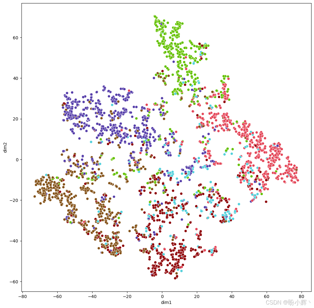 (3) 最后,我们使用训练好的 GAT 模型对所有图节点进行预测,并将 6 维节点类别概率经 t-SNE 降维至 2 维实现可视化: