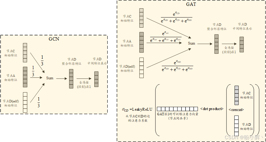 我们已经在文本数据中学习过注意力机制,在文本数据的上下文中,其本质是为句子中的不同单词分配差异化的重要性权重,从而聚焦关键部分进行后续处理。在 GAT 中,注意力机制允许模型在分类节点类型时,为不同邻居节点分配不同的权重,从而构建更复杂、更强大的模型。通过注意力机制,我们可以为每个邻居节点学习注意力系数,这些系数为模型增加了可训练参数。下图展示了 GAT 与 GCN 在聚合邻居节点特征时的对比。