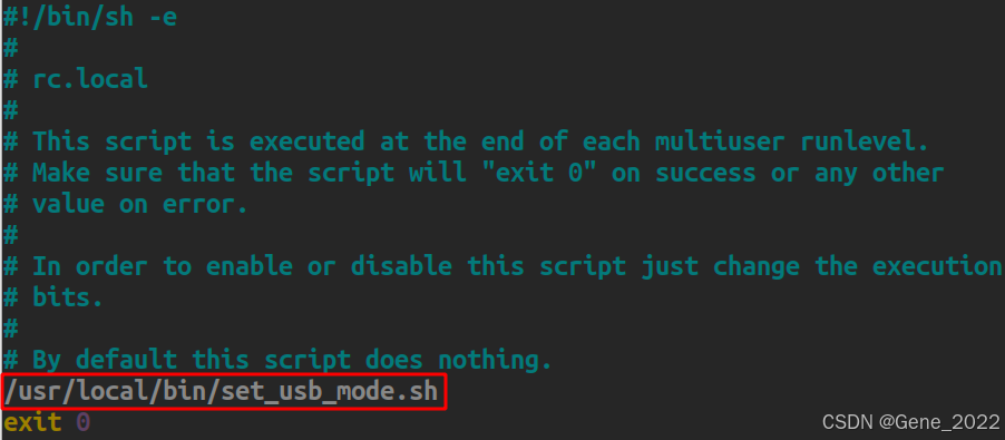 接着,编辑/etc/rc.local文件,在文件末尾的exit 0之前,添加 set_usb_mode.sh可执行脚本路径 。