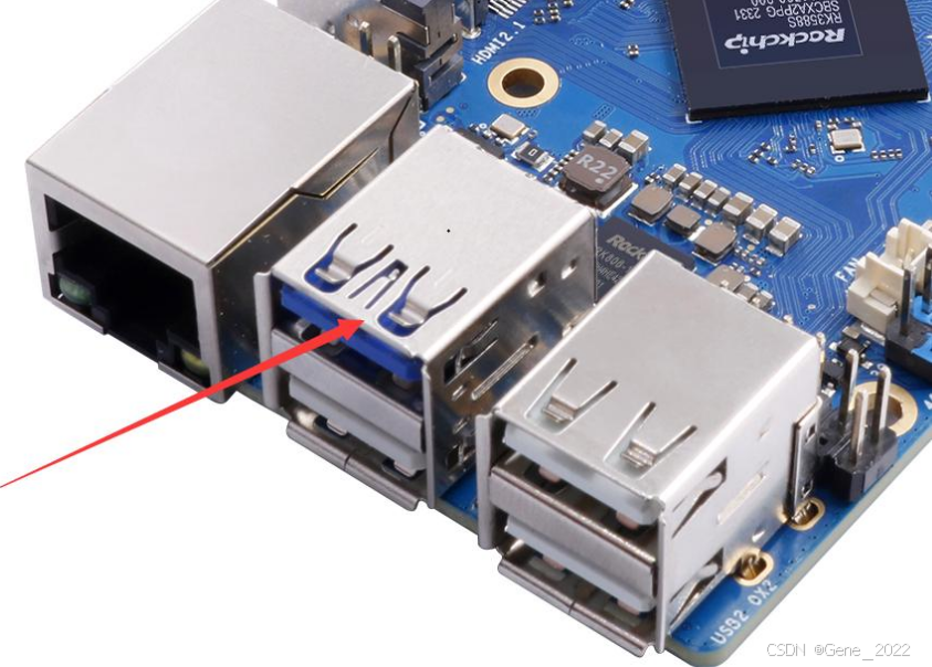 首先准备一根品质良好的 USB2.0 公对公数据线,通过 USB2.0 公对公数据线连接好开发板与 Ubuntu PC,开发板支持 device功能的 USB2.0 接口的位置如下图所示: