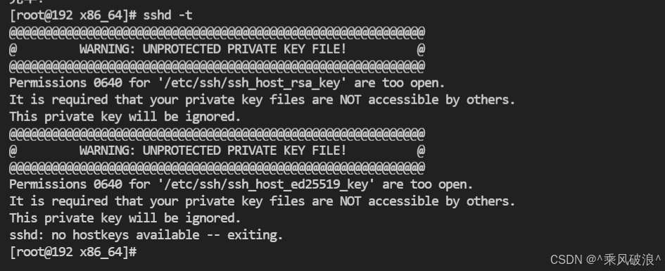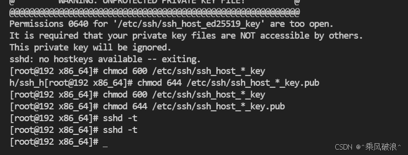 `chmod 600 /etc/ssh/ssh_host_*_key chmod 644 /etc/ssh/ssh_host_*_key.pub`临时禁用SELinux: setenforce 0 systemctl restart sshd vim /etc/ssh/sshd_config 修改以下两行