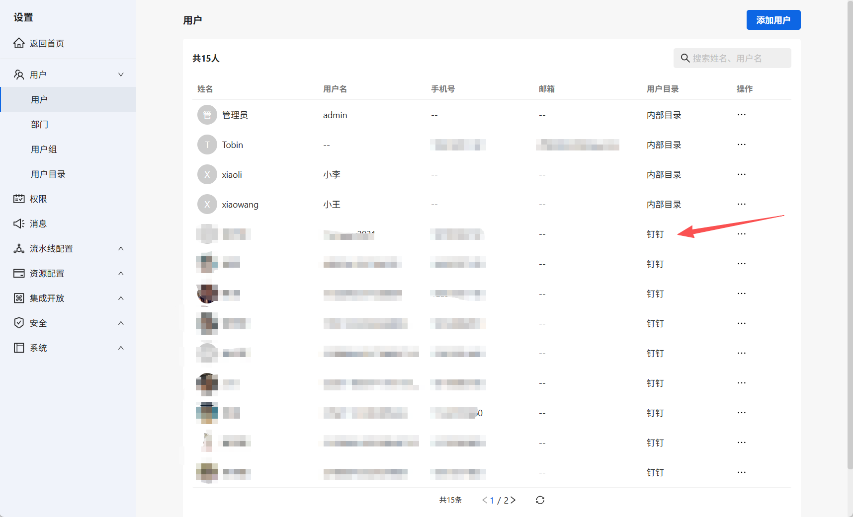 配置完成后在用户列表可以查询到同步的钉钉用户。