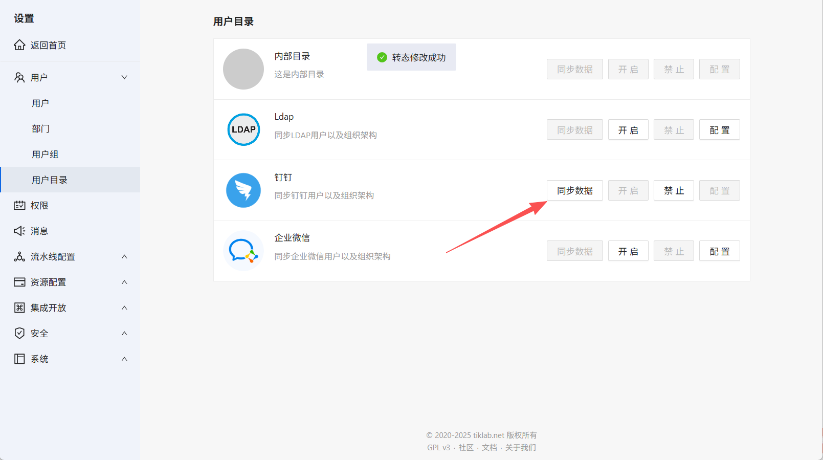 配置成功后点击开启,此时同步数据的按钮会亮起,点击同步数据,就会把钉钉下的用户信息同步到Arbess。