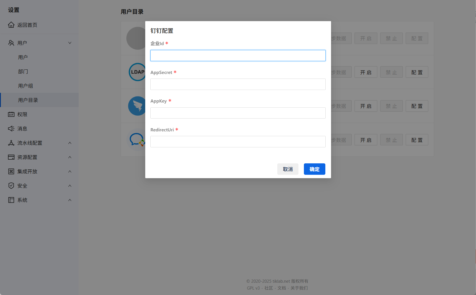 配置钉钉登录,首先需要填写钉钉的信息,开启钉钉配置后即可同步用户信息及登录。