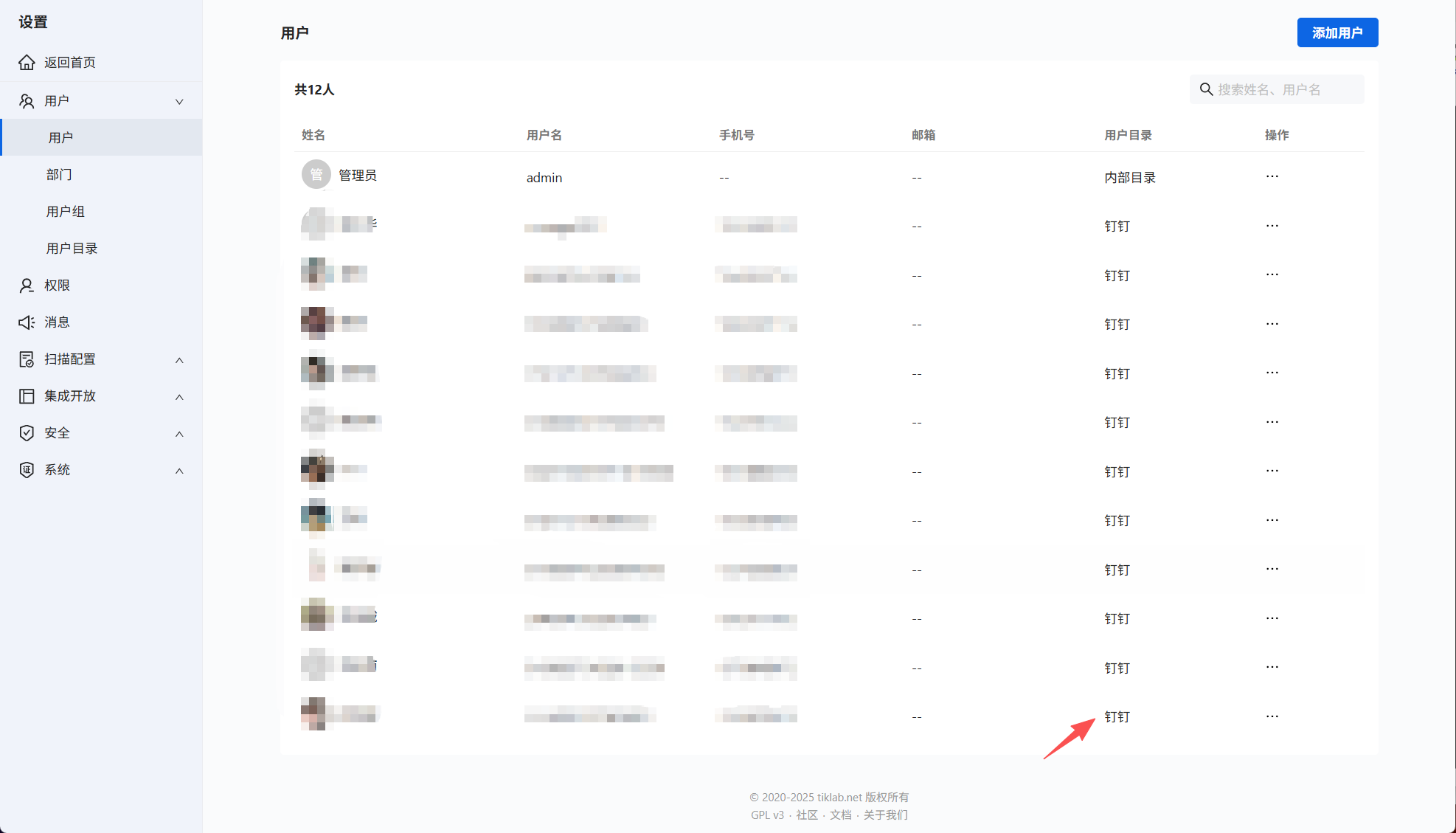 配置完成后在用户列表可以查询到同步的钉钉用户。