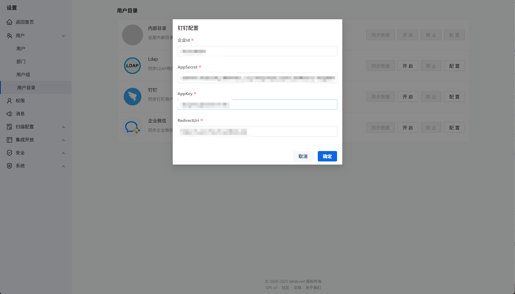 配置钉钉登录,首先需要填写钉钉的信息,开启钉钉配置后即可同步用户信息及登录。